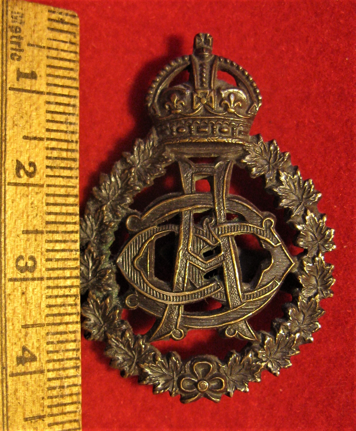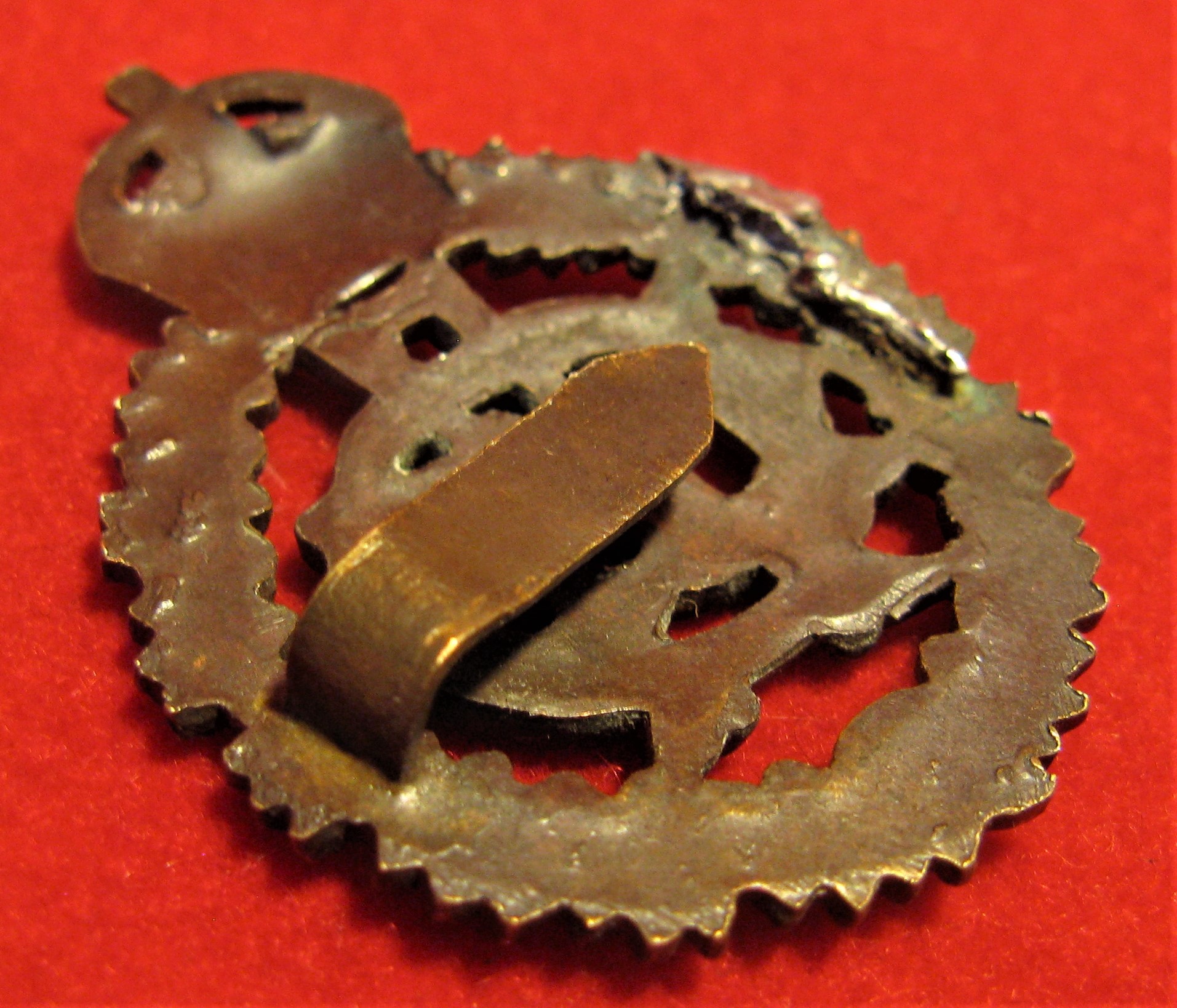 Above are the scans for this example of a WWI Royal Army Dental Corps Cap Badge. This example still has one original flat type lug still attached. Nevertheless, an original period badge and it displays well . A rather heavy patina on this copper badge.
