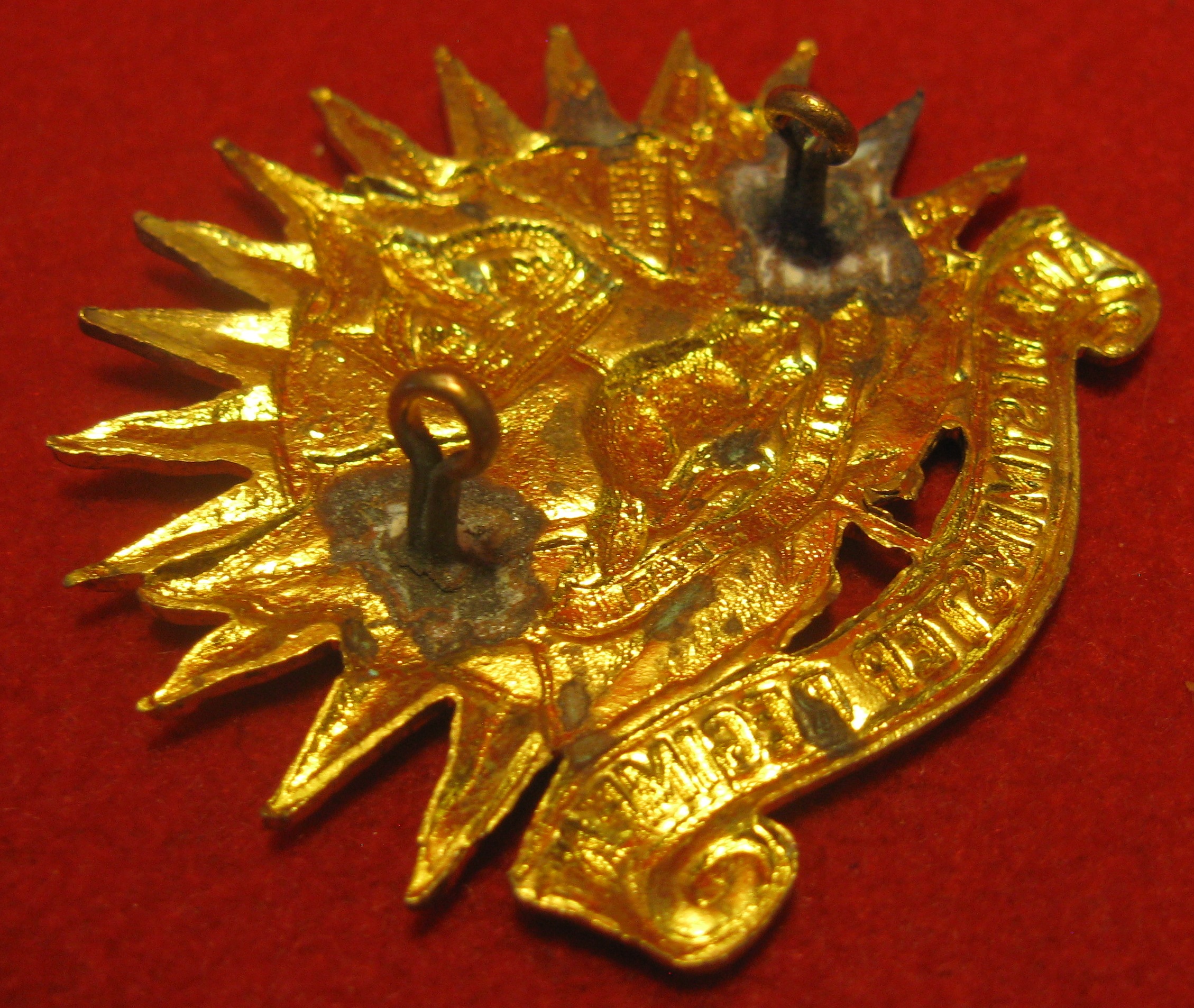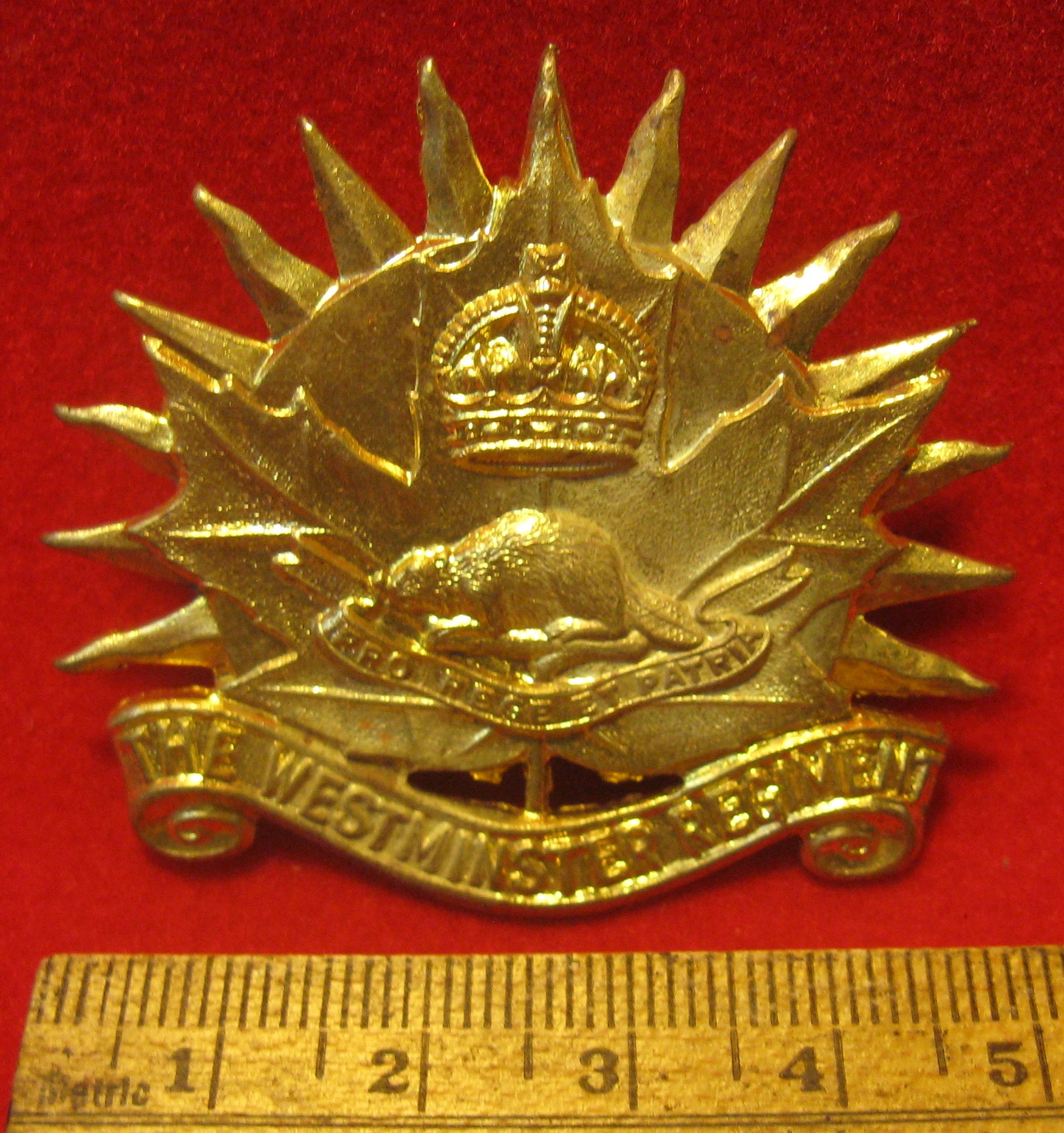 You are viewing the cap badge for the New West Minister Regiment out of British Columbia. This badge is made of brass and is in fine condition with both original lugs intact.