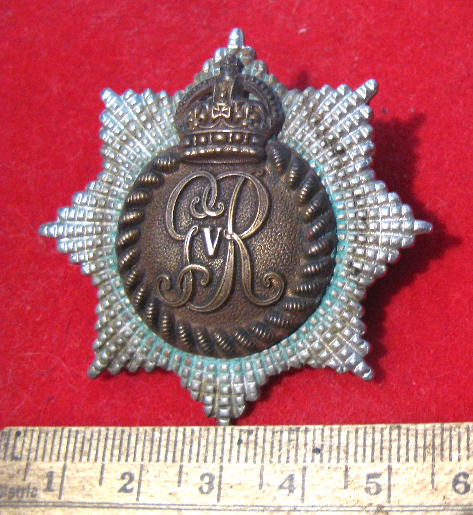 Above are the scans of this excellent RCR Cap Badge from the WWI era. The badge shows a George V cypher This fine clean example still has its unusual flat type lug attachments in good order. A typically large solid heavy bimetal badge still in excellent condition.