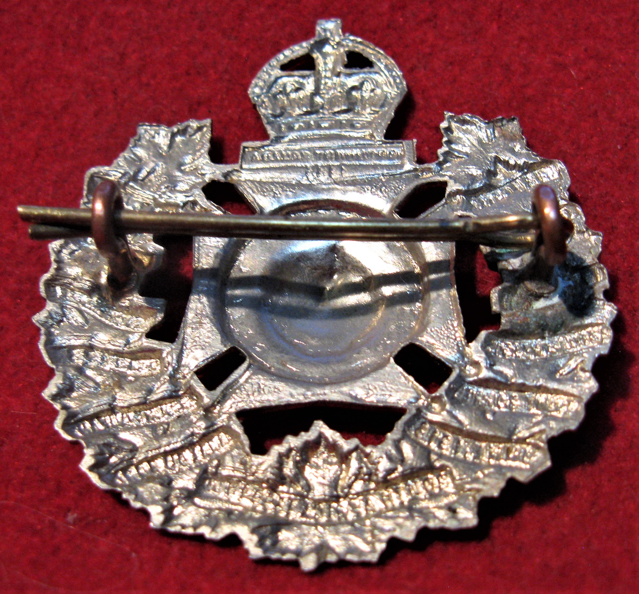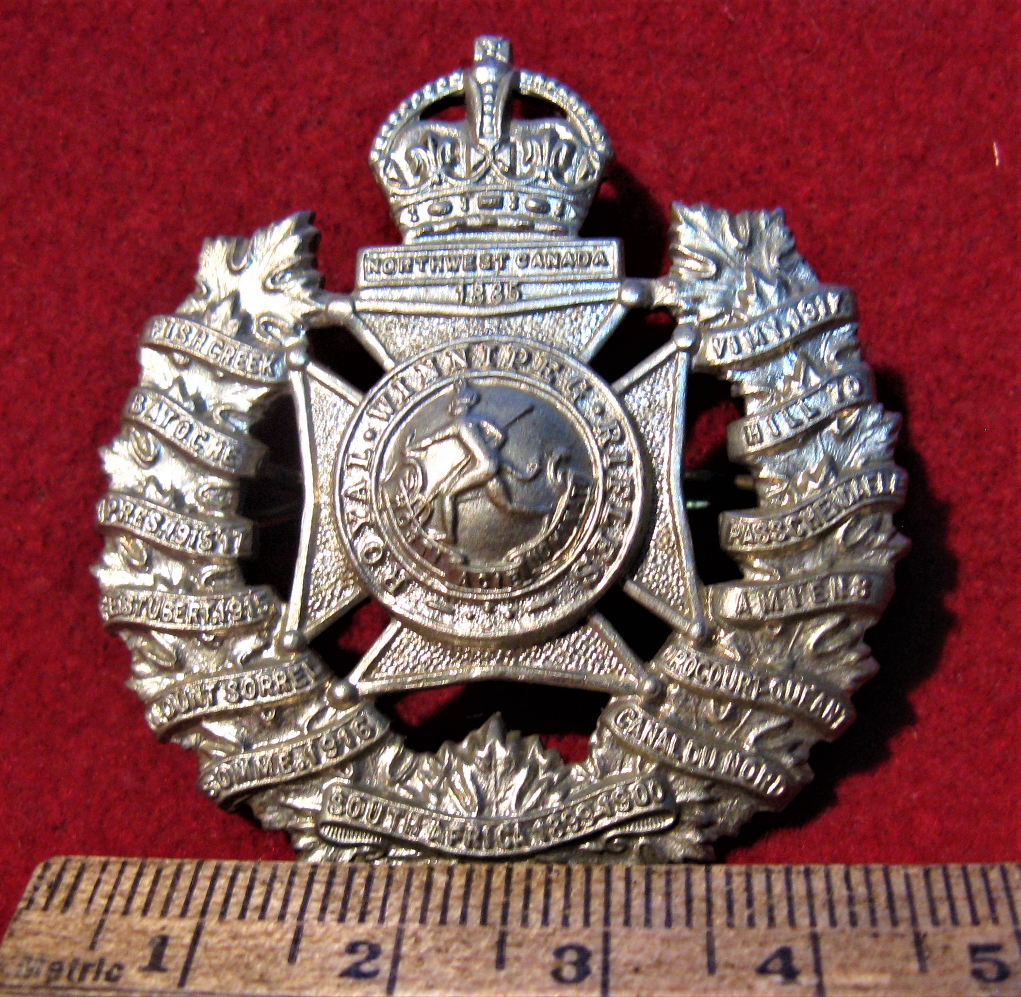 You are viewing a large WW2 era Winnipeg Rifles Cap Badge. This badge has both its original welded stem lugs, and comes with its cross pin as found. The badge is designed with a wreath of maple leaves covered with this historic regiment's Battle Honors, surrounding a small stylized Maltese cross with the regimental name surrounding the original "devil" image of the regiment. Made of white metal and still a very clean badge.